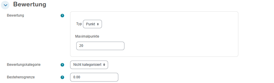 - Bewertungseinstellungen können direkt in der Aktivität vorgenommen werden (abhängig vom gewählten Inhaltstyp).
