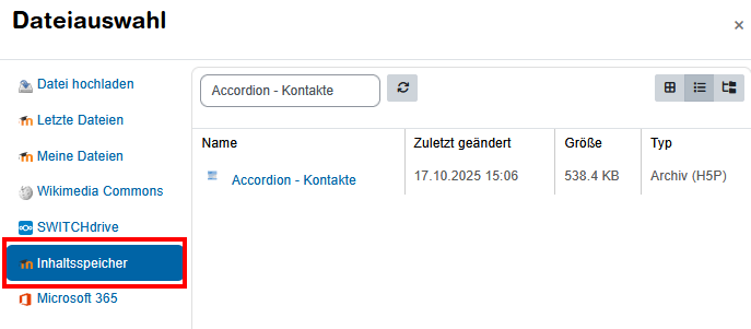 - Im Popup links auf Inhaltsspeicher klicken und über das Suchfeld den H5P-Inhalt suchen und diesen auswählen