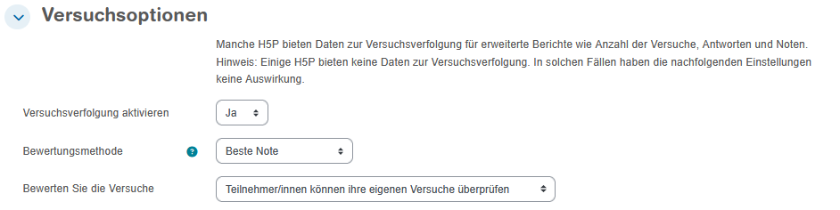 Bei H5P-Inhalten, welche eine Bewertung vorsehen, können hier die Einstellungen für die Versuche vorgenommen werden.