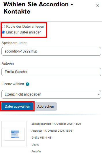 Kopie: Im Kurs wird eine Kopie des Inhalts im Inhaltsspeicher erstellt, losgelöst vom Original. Änderungen am Original werden nicht in Kopie übernommen - Auf Datei auswählen klicken