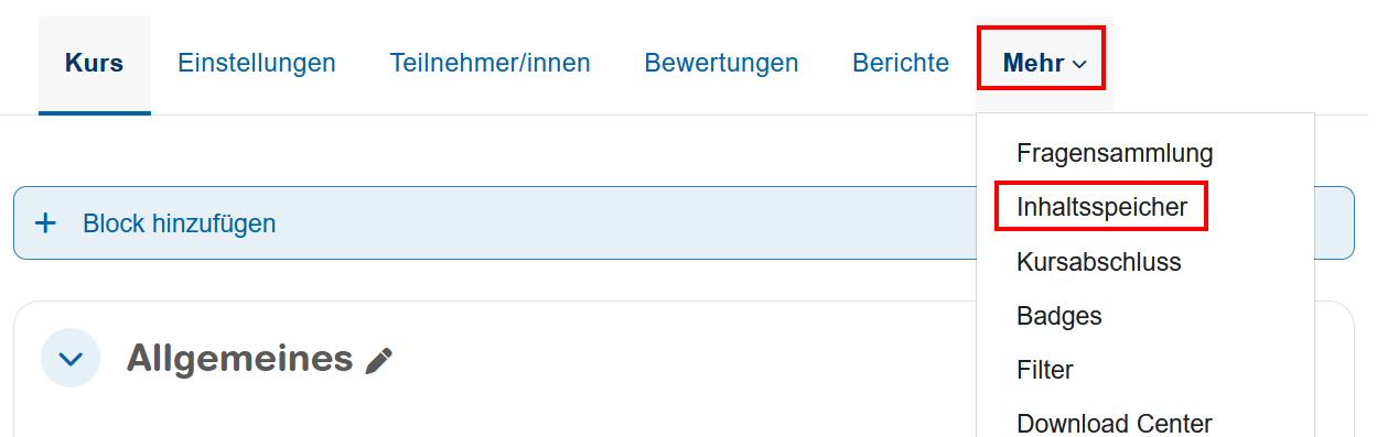 - Links Inhaltsspeicher wählen, es wird der Inhaltsspeicher des aktuellen Kurses angezeigt