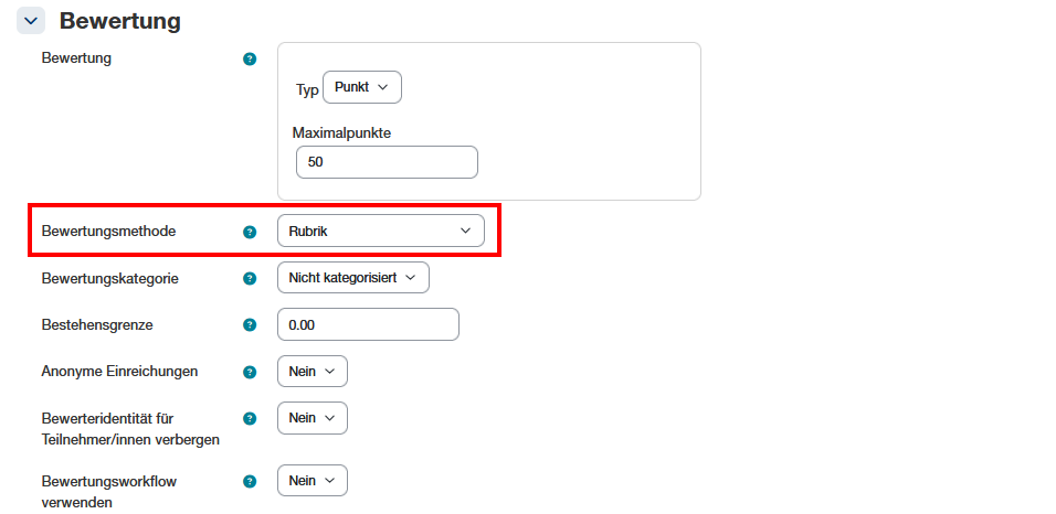 - Punkte für jedes Level zur Evaluation anzeigen: Wenn diese Option deaktiviert ist, werden den Bewerter:innen während des Bewertungsvorganges nur die Levelbeschreibungen ohne Punkte angezeigt. Sofern den Studierenden die Rubriken angezeigt werden, sehen Studierende je Level die Punkte trotzdem.