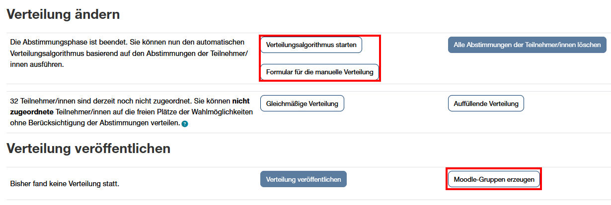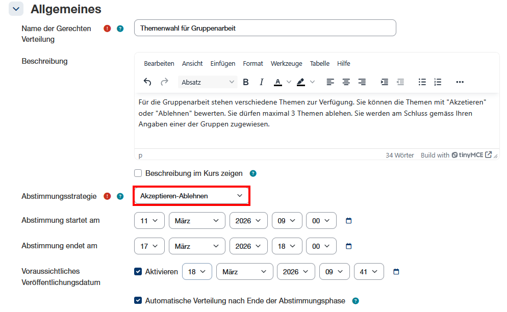 - Automatische Verteilung nach Ende der Abstimmung: Mit dieser Einstellung wird der Verteilungsalgorithmus automatisch gestartet. Die Ergebnisse der Verteilung müssen aber manuell veröffentlicht werden.