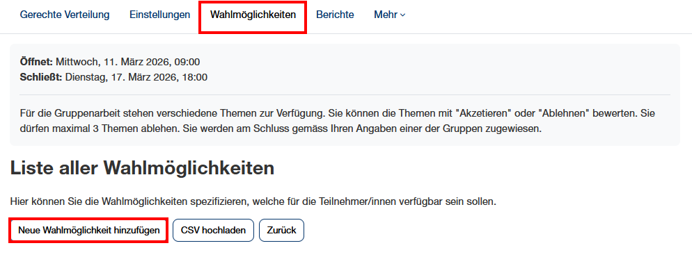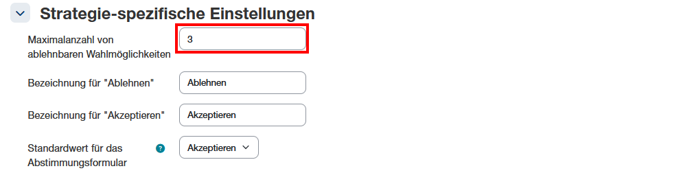 - Maximal Anzahl von ablehnbaren Wahlmöglichkeiten: Damit Studierende nicht alle Wahlmöglichkeiten ablehnen können, sollte immer eingestellt werden, wie viele der Wahlmöglichkeiten Studierende ablehnen dürfen.