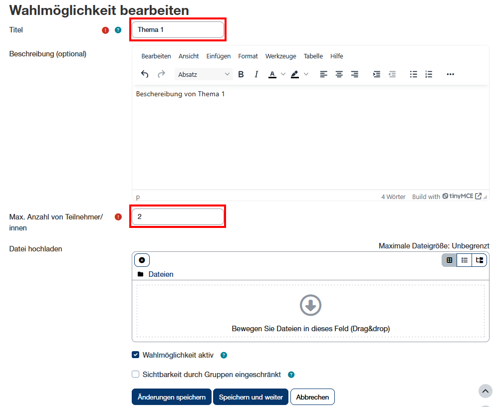 - Beschreibung: Damit Studierende mehr über die Wahlmöglichkeit bzw. das Thema erfahren, kann hier optional eine Beschreibung hinterlegt werden