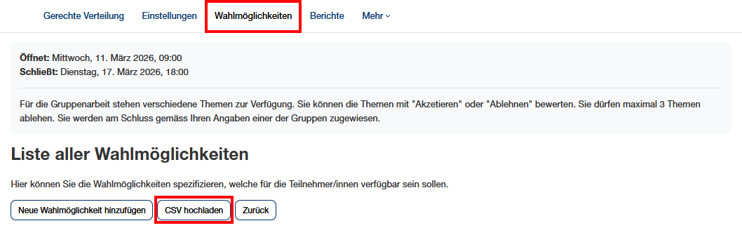 Die Wahlmöglichkeiten können auch in einer CSV-Datei erfasst und anschliessend hochgeladen werden.