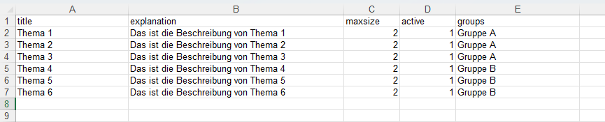 - groups: Gruppenname, falls die Wahlmöglichkeit nur Mitgliedern von spezifischen Gruppen angezeigt werden soll. Ansonsten die Spalte einfach leer lassen
