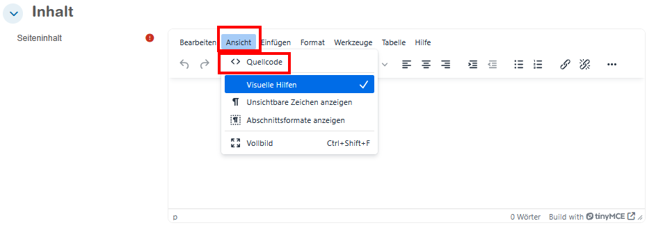 - Im Texteditor über das Menü Ansicht die Option Quellcode wählen