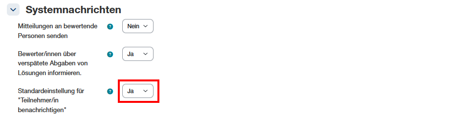 • Mitteilungen an bewertende Personen senden: Ist diese Option aktiviert, erhalten alle im Kurs eingeschriebenen Teacher und Non-editing-Teacher eine Mail-Benachrichtigung, sobald Studierende eine Arbeit einreichen.
