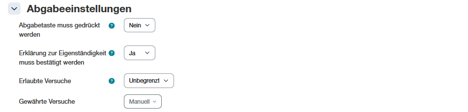 - Manuell: Studierende können ihre Abgaben bis zur Deadline hochladen und austauschen. Wird die Arbeit durch Teacher bewertet, öffnet sich kein neuer Versuch. Für Arbeiten, welche eingereicht und einmal bewertet werden, empfehlen wir diese Einstellung.