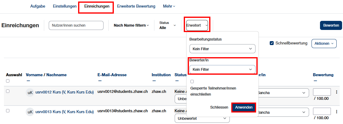3. Abgaben nach Bewerter:in filtern