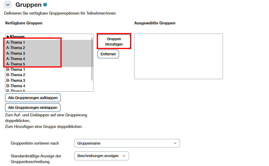 Die im Kurs vorhandenen Gruppen werden auf der linken Seite angezeigt.