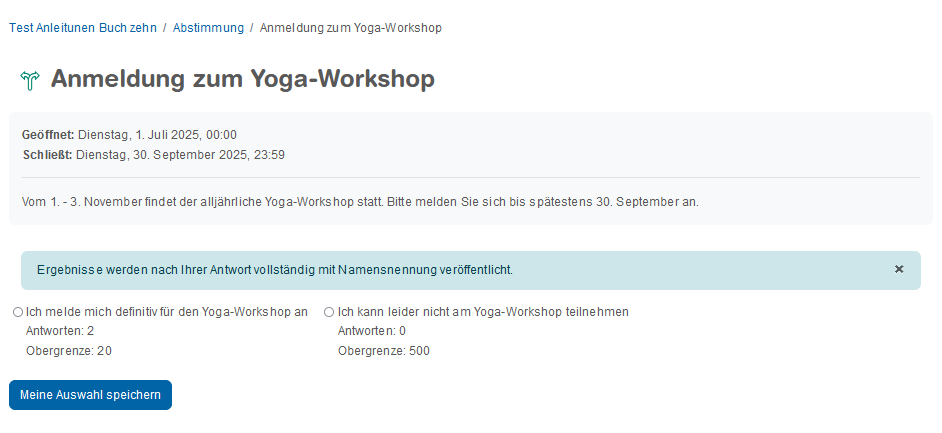 - Hier können Teilnehmer:innen ein Wahl treffen und diese speichern.