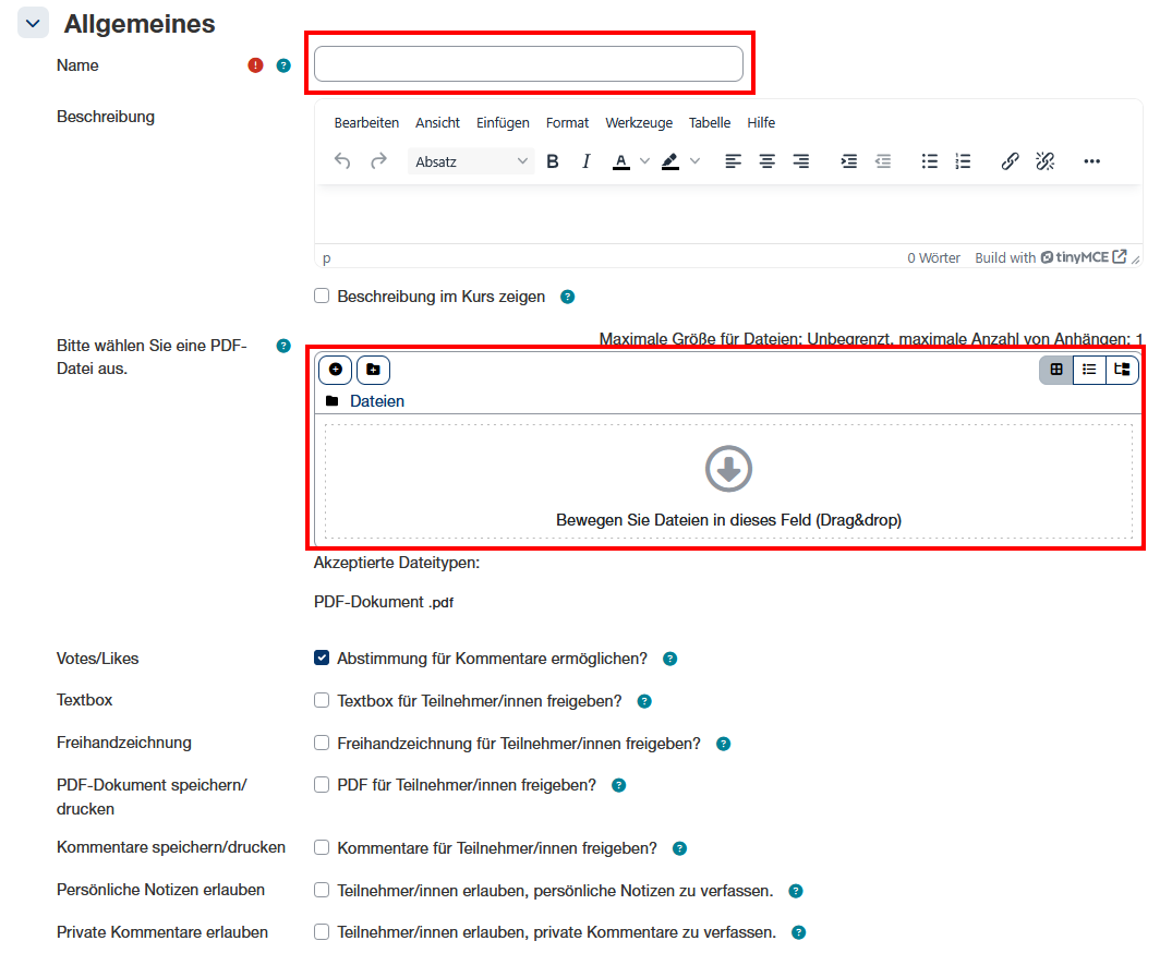 - Beschreibung: Z.B. kurze Anleitung für Studierende, was in der PDF-Annotation erwartet wird.
