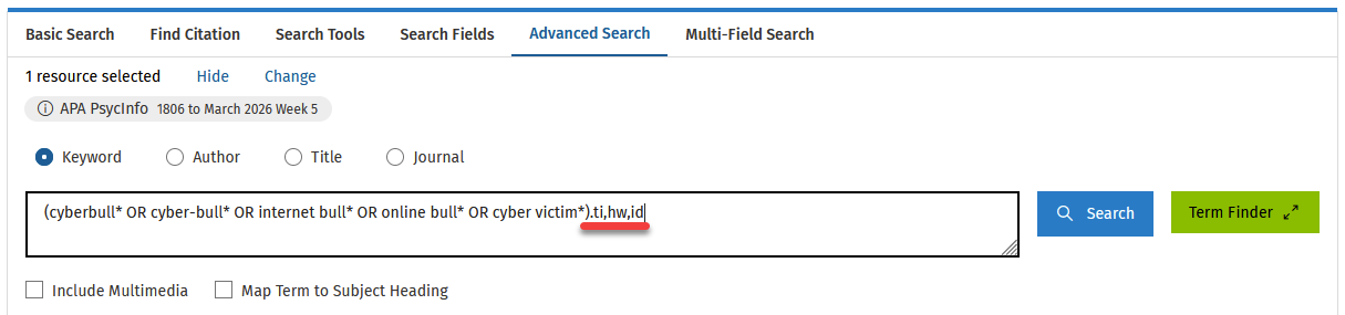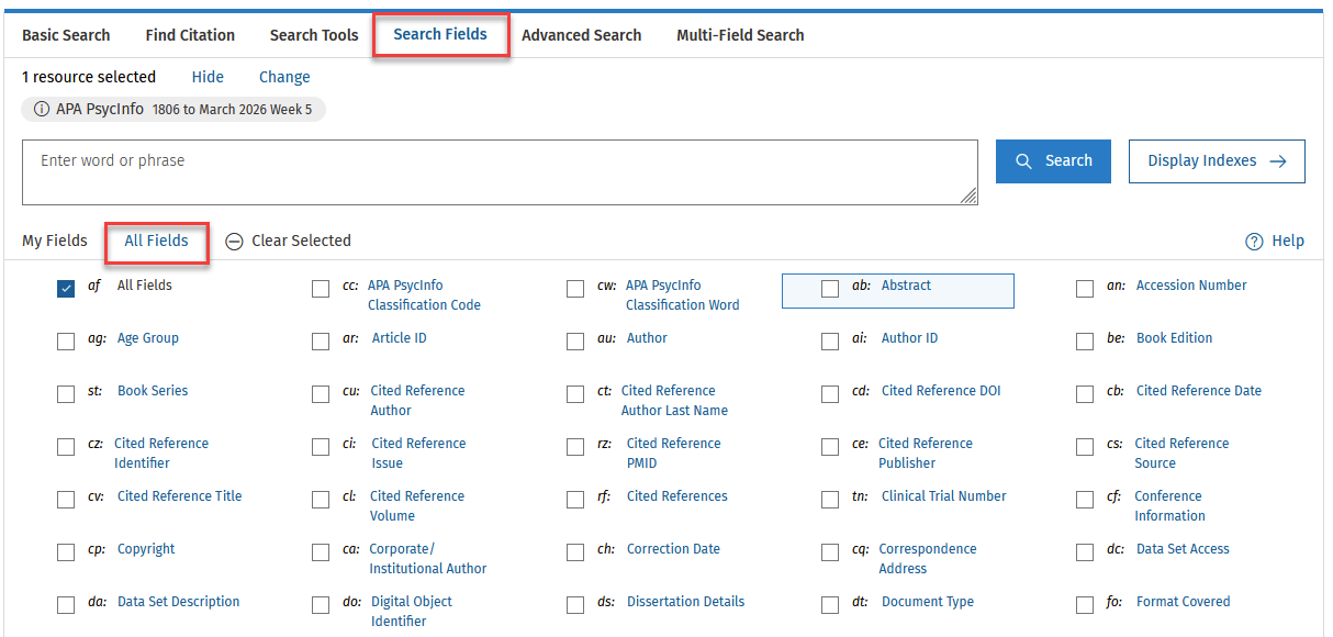 Standardmässig wird in der Advanced Search in .mp (most powerful, multi purpose) gesucht. Dies umfasst die wichtigsten Felder wie title, abstract, heading word, table of contents, key concepts, original title, tests & measures, mesh word.