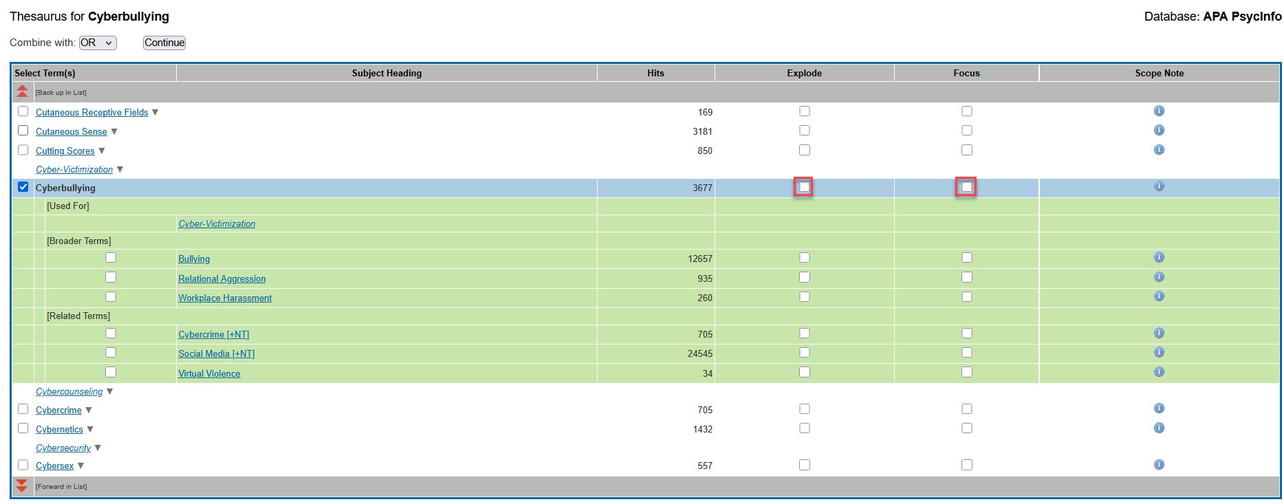 - Mit Explode erweitern Sie die Suche, indem Sie nach dem Schlagwort sowie den untergeordneten Schlagwörtern (Narrower Terms) suchen.